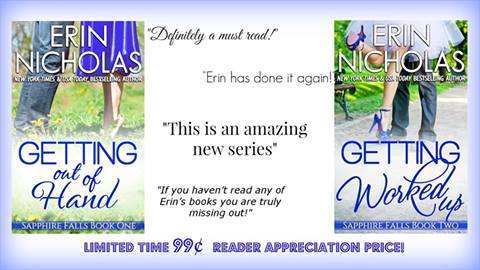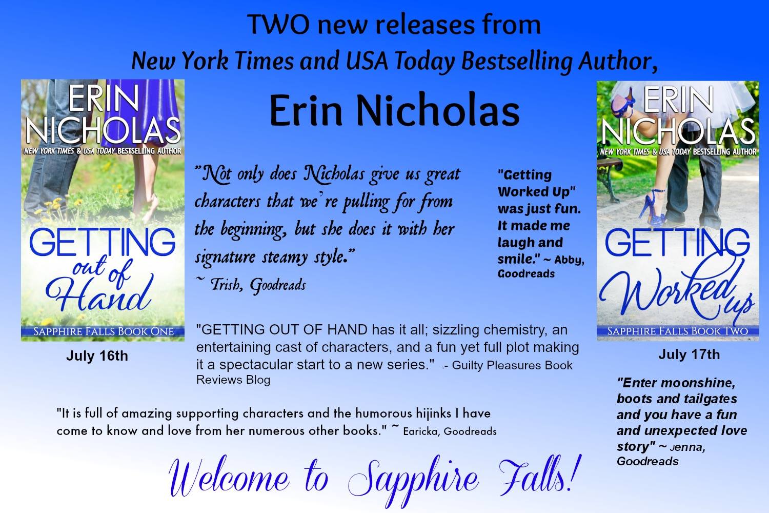 Sapphire Falls comes with a cast of adorable, quirky, sassy, enchanting characters that round out this story in such an enjoyable way. Erin writes so splendidly I felt right in the middle of what was happening as if I was there laughing and plotting along instead of merely reading about it. The ending was marvelous. A true romantic, I love nothing better than a great HEA ending. Getting Out of Hand delivers in a sigh-worthy way, leaving me wishing for more. I can’t wait for the second book in the series, Getting Worked Up, and more fun with the people in Sapphire Falls. 5 stars
