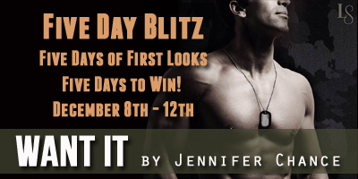 Erin Connelly meets alpha male Zander James in WANT IT, the third novel in Jennifer Chance’s sizzling Rule Breakers series! This one is not to be missed by readers looking for their military romance fix!